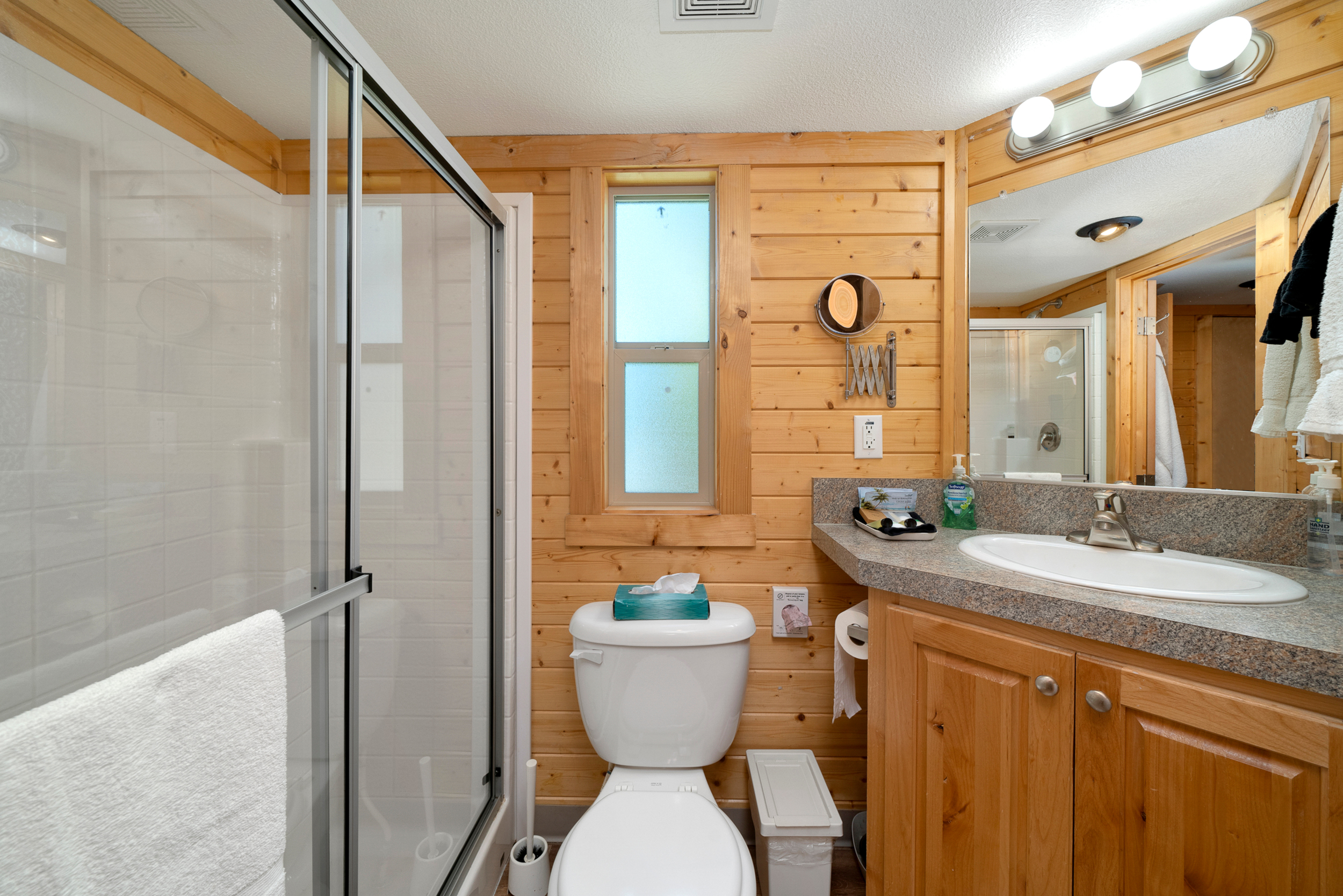 Bathroom – Full size walk-in shower, vanity mirror, toilet.